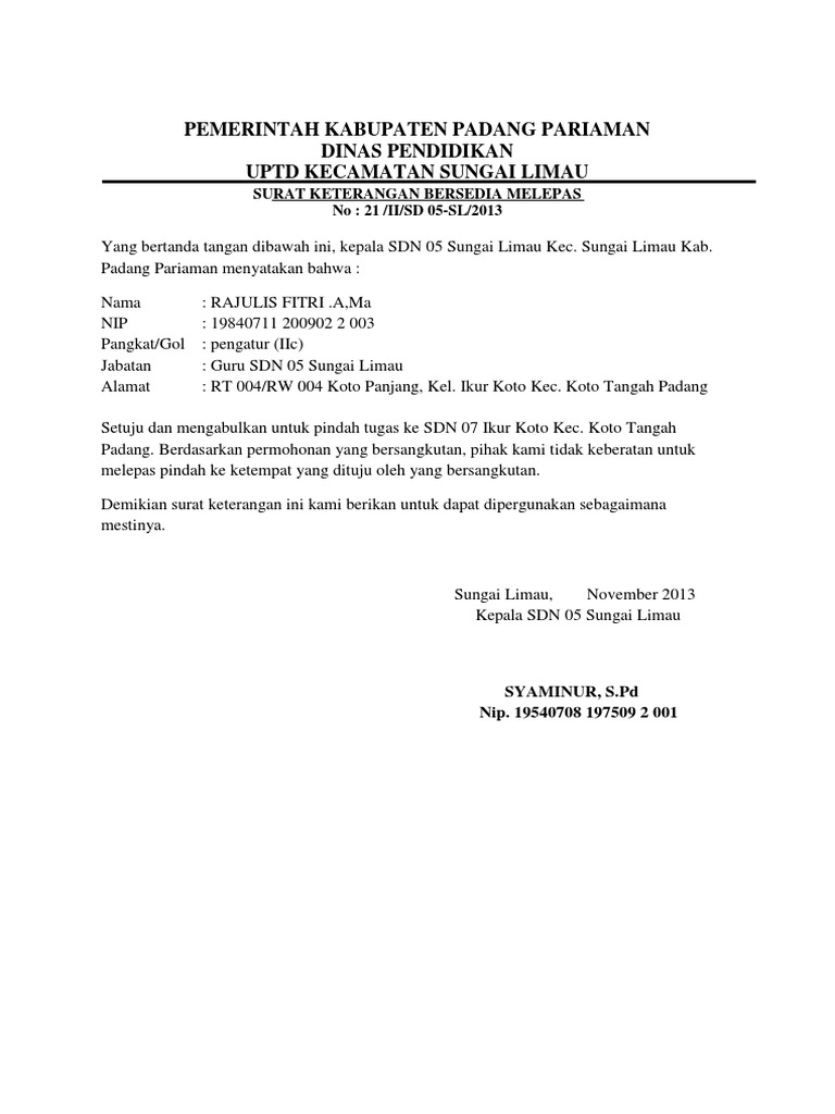 Mutasi Tempat Tugas Contoh Surat Pernyataan Pelepasan Dan Penerimaan